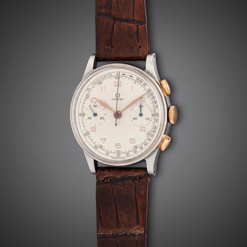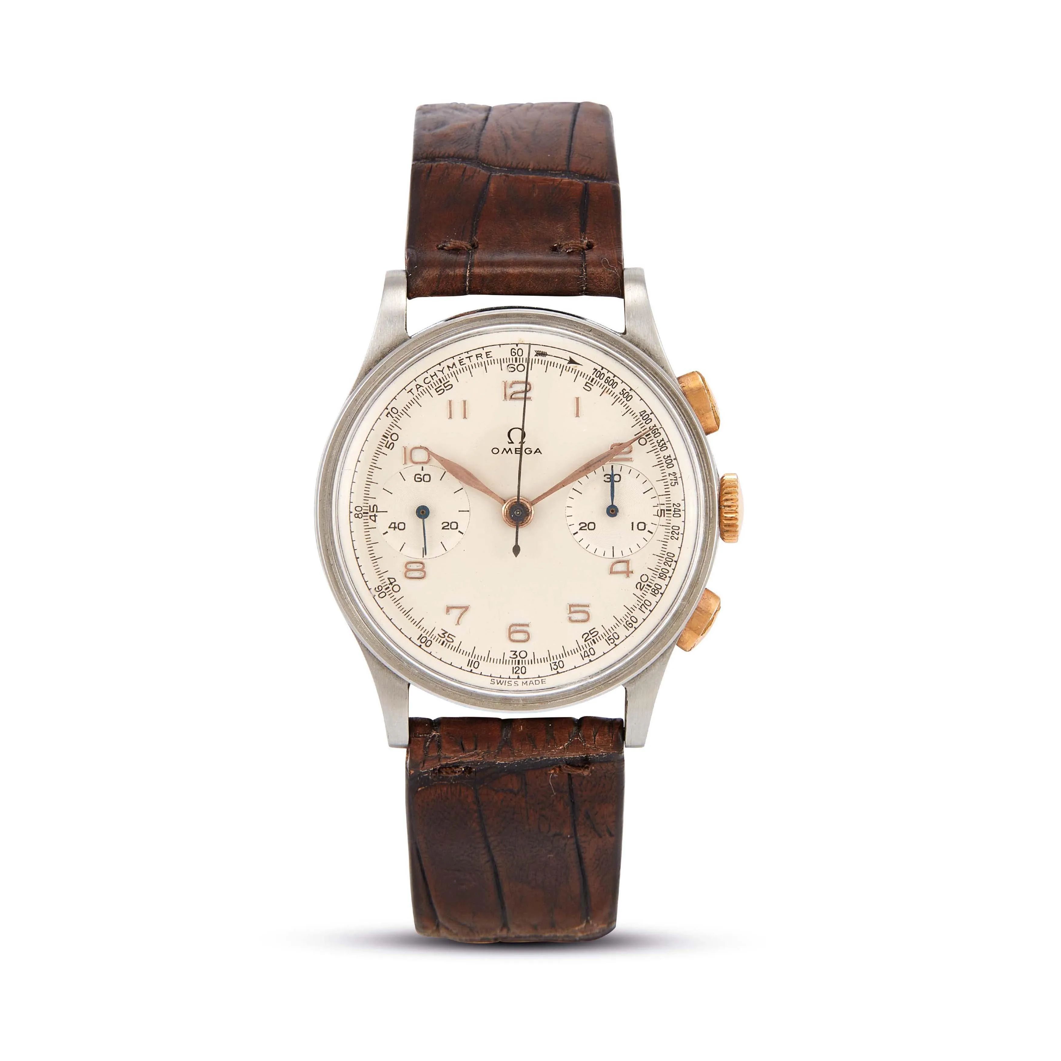 cassa in acciaio staybrite, fondello a pressione, tasti del crono a oliva, quadrante originale argentè, grafica nera, due contatori, secondi a ore nove, scala tachimetrica, numeri arabi applicati, movimento a carica manuale cal 33.3, cinturino in pelle marrone non originale con fibbia in metallo marcata Omega, vetro plastica. Diam. mm 37
