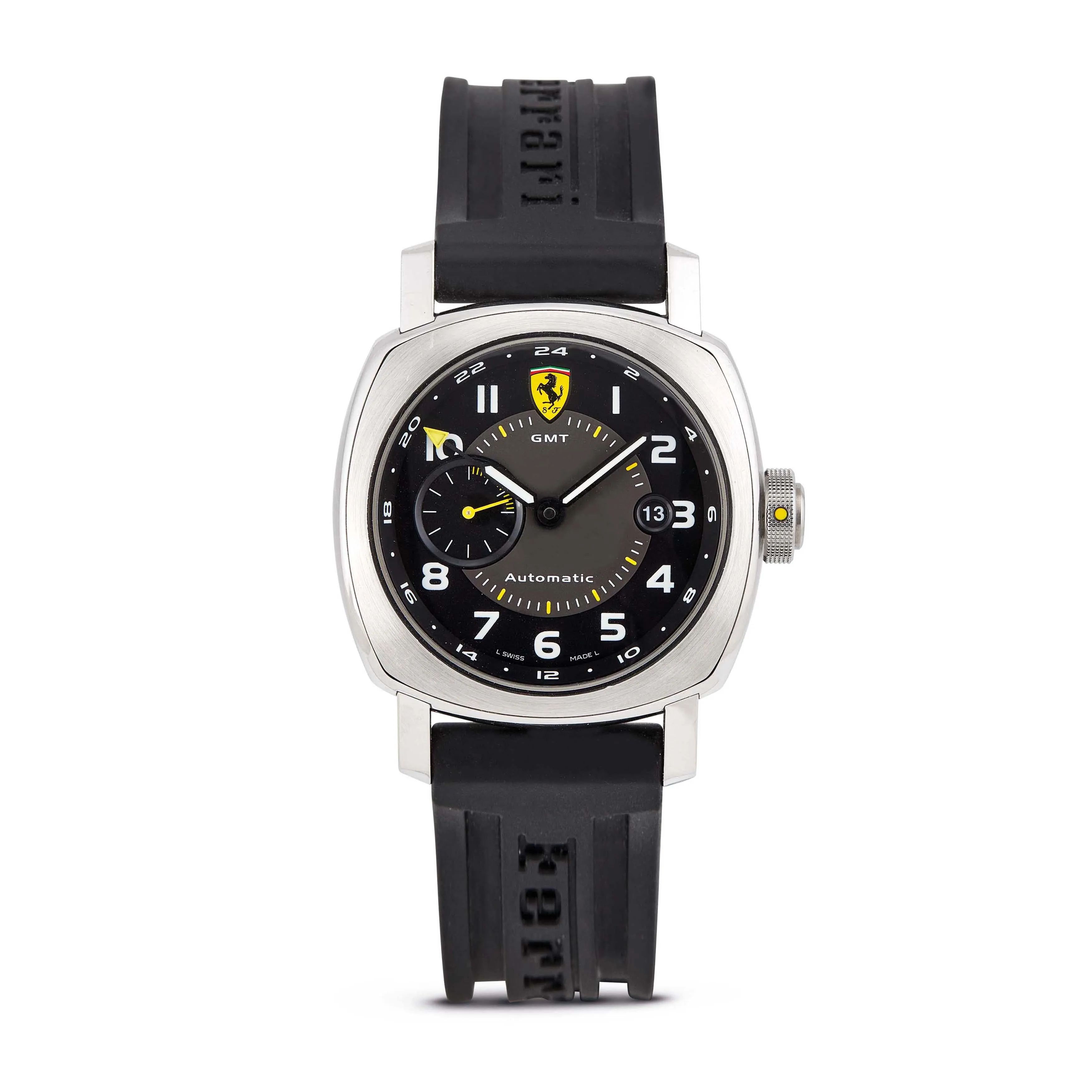 cassa in acciaio, fondello a vite, corona con logo Ferrari, indicazione del fuso orario sul disco rehaut, quadrante nero con sfera centrale in grigio, grafica bianca, numeri arabi al luminova, secondi a ore nove, datario a ore tre, movimento a carica automatica, cinturino in gomma di colore nero con fibbia doppia deployant in acciaio marcati Ferrari e Officine Panerai, vetro minerale. Diam. mm 44.