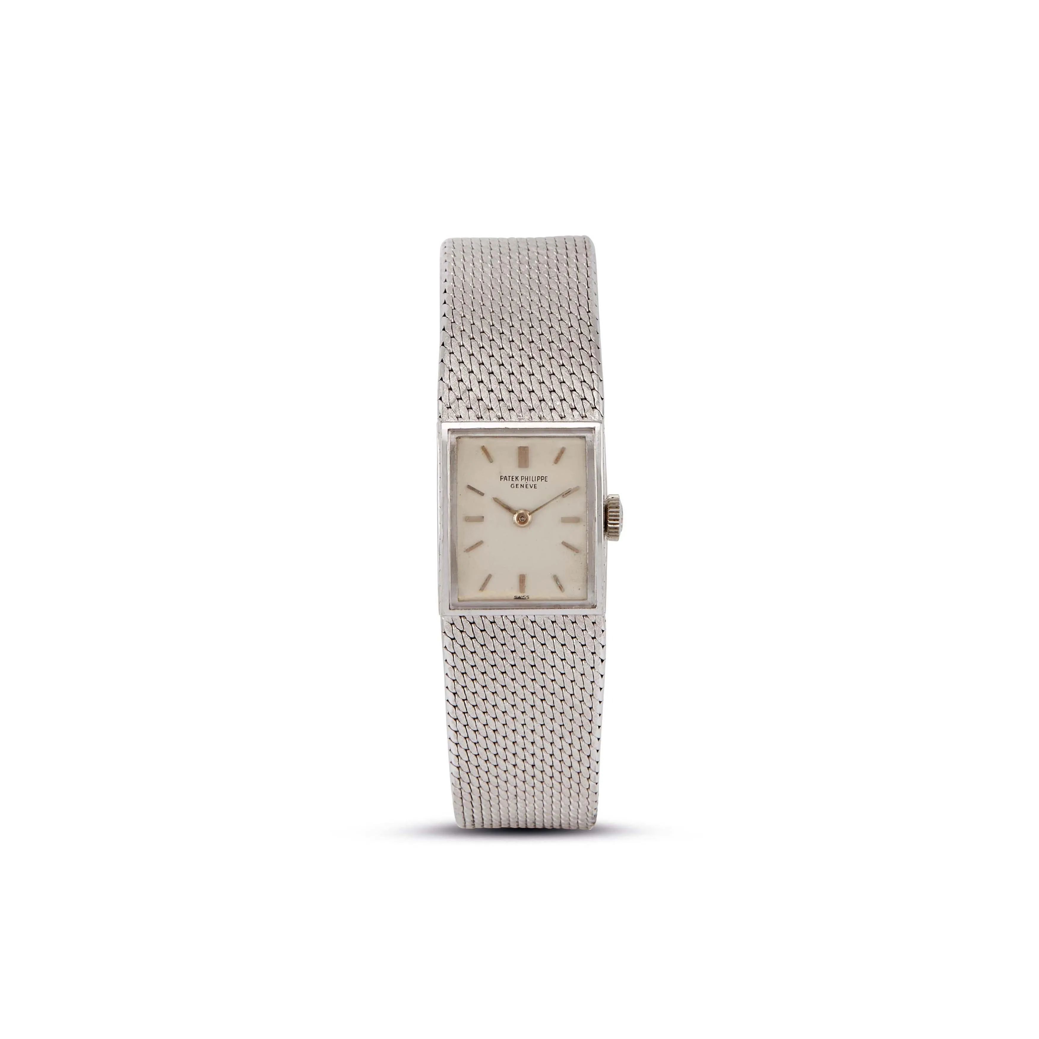 cassa di forma in oro bianco 18kt, fondello a pressione, corona marcata, quadrante argentè, grafica nera, indici applicati, movimento a carica manuale n. 994812, bracciale integrato in oro bianco 18kt a maglia tessita con chiusura a scomparsa marcata Patek Philippe, lungh. cm 16 circa, vetro minerale, gr. 55. Dim. mm 16x18. Corredato di scatola.