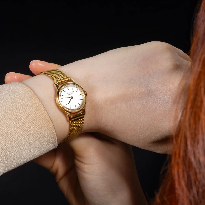 cassa in oro giallo 18kt, fondello a pressione, corona marcata, quadrante argentè (difetto), indici applicati, movimento a carica manuale n. 856300, bracciale a maglia tessita marcato Patek Philippe in oro giallo 18kt con chiusura a scomparsa, punzone Gay Freres, lungh. interna cm da 16 a 18, vetro plastica, gr. 42. Diam. mm 24.