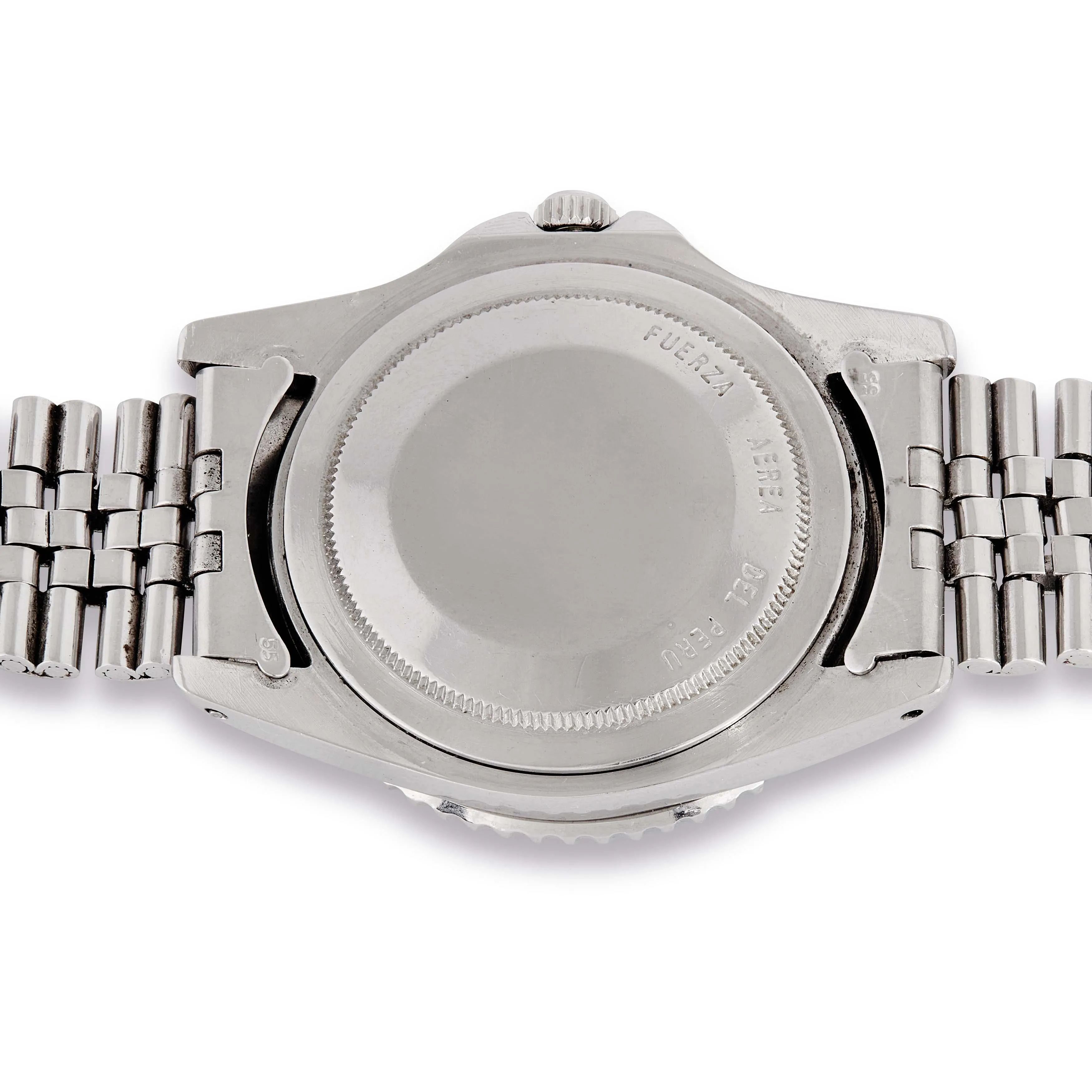 Il Rolex GMT Master ref. 1675, fu fornito all’Aeronautica peruviana, unità dell’esercito nata agli inizi del 900 e consolidata negli anni ’50 con l’unione della marina e dell’esercito peruviani. L’unità militare F.A.P., Fuerza Aerea del Perù, come molte altre compagnie militari del tempo, decise di dotare i propri piloti e ufficiali di alto rango degli orologi più precisi dell’epoca. I segnatempo consegnati alla F.A.P. furono realizzati su modelli di produzione standard ma recavano caratteristiche distintive a partire dal fondello con la peculiare incisione "Fuerza Aerea del Peru".