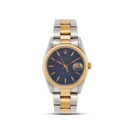 cassa in acciaio, fondello serrato a vite, corona marcata, ghiera zigrinata in oro giallo, quadrante blu, grafica oro, indici applicati con trizio, datario a ore tre con lente cyclope, movimento a carica automatica cal 3135 n. 5265192, bracciale oyster in acciaio e oro ref. 78353 finali 457B, lungh. interna cm 20 circa, chiusura a scatoletta in acciaio marcata Rolex, vetro minerale, gr. 100. Diam. mm 34. Corredato di scatola, garanzia, libretti e una maglia aggiuntiva.