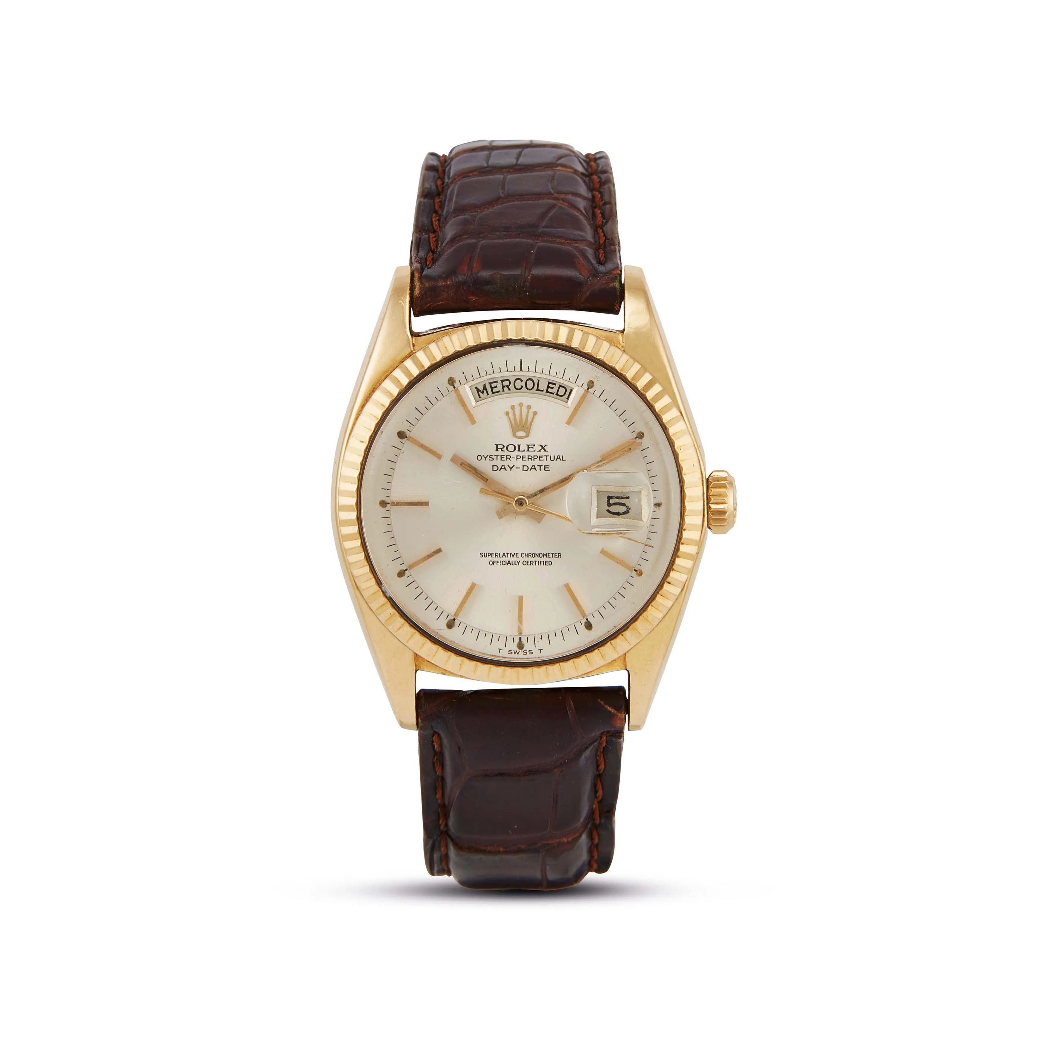 cassa in oro giallo 18kt, fondello serrato a vite, corona marcata, ghiera zigrinata in oro giallo 18kt, quadrante argenté a scalino, grafica nera, indici applicati con trizio, datario a ore tre con lente cyclope, finestra del giorno della settimana a ore dodici in italiano, movimento a carica automatica cal 1555 n. DD66686, cinturino in pelle marrone non originale, fibbia in oro giallo 18kt marcata Rolex, vetro plastica, gr. 63. Diam. mm 35. Corredato di scatola.