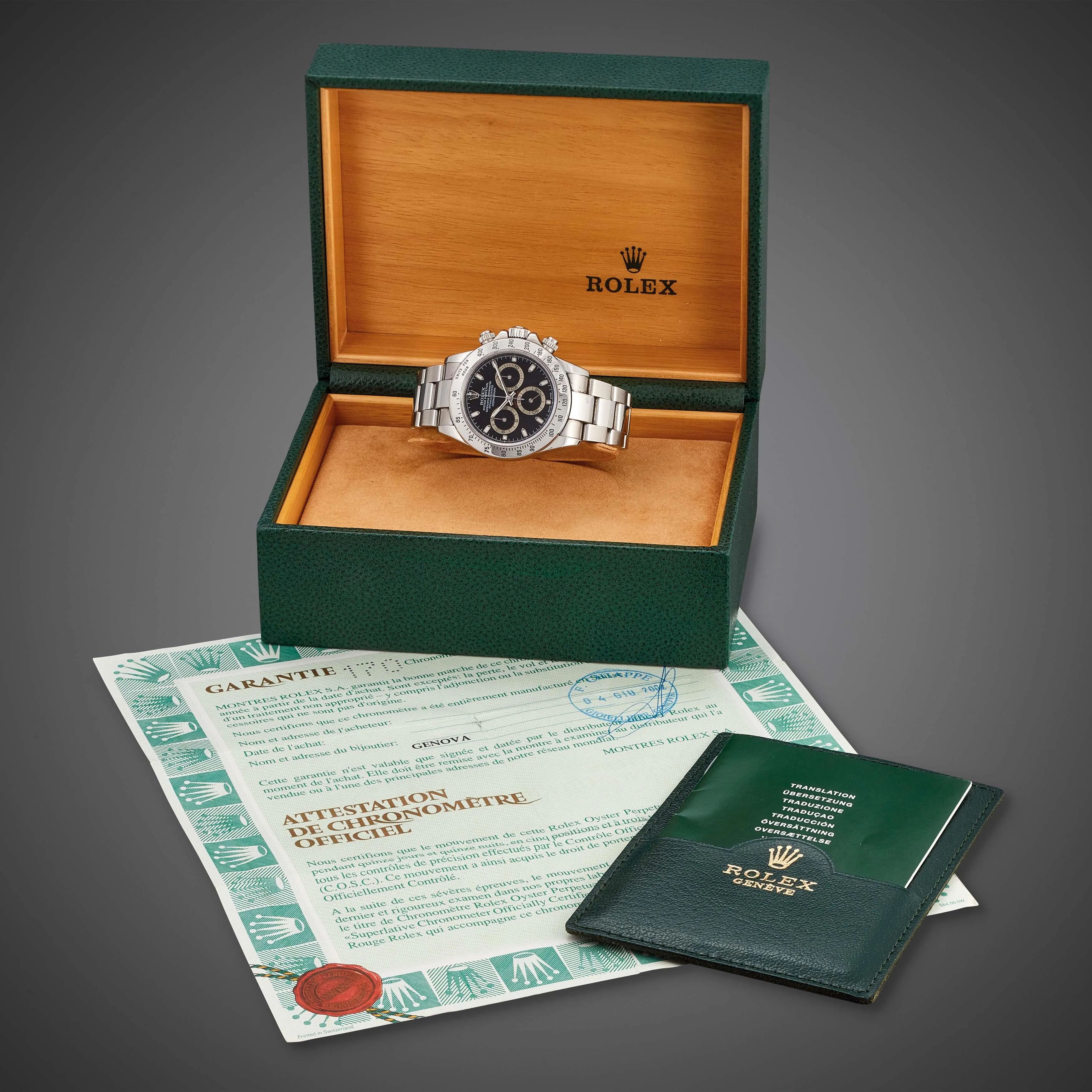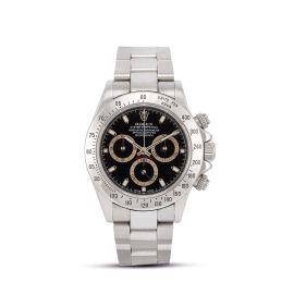 cassa in acciaio, fondello serrato a vite, corona marcata e pulsanti a vite, ghiera in acciaio con scala tachimetrica a 400, quadrante nero, grafica bianca, indici applicati al superluminova, tre contatori, secondi a ore sei, movimento a carica automatica cal 4130 n. C 003063, bracciale oyster a maglie piene satinate e lucide in acciaio ref. 78490 cod. produzione DE10, lungh. interna cm 18, chiusura a scatoletta in acciaio marcata Rolex, vetro minerale. Diam. mm 40. Corredato di garanzia e una maglia aggiuntiva.