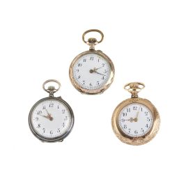 composto da tre piccoli orologi da tasca in argento, di cui uno dalla cassa niellata, quadrante bianco, numeri romani e arabi, due con movimento a carica manuale, uno con carica a chiavetta. Difetti.