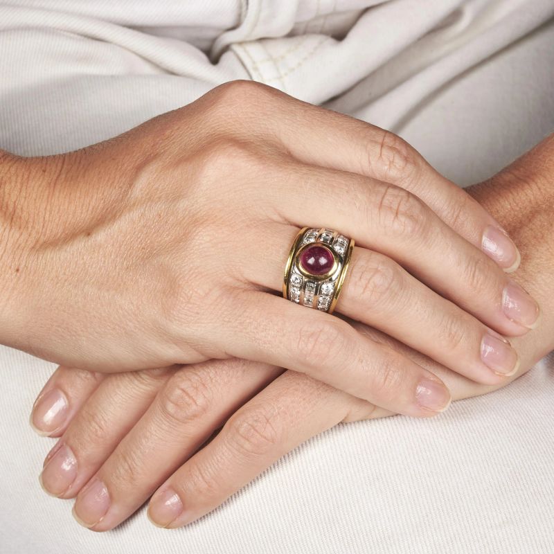 in oro giallo e bianco 18kt, impreziosito al centro da un rubino taglio cabochon di ct 3.50 circa, circondato da diamanti taglio brillante e carré per ct 1.90 circa, mis. 15/55, gr. 12