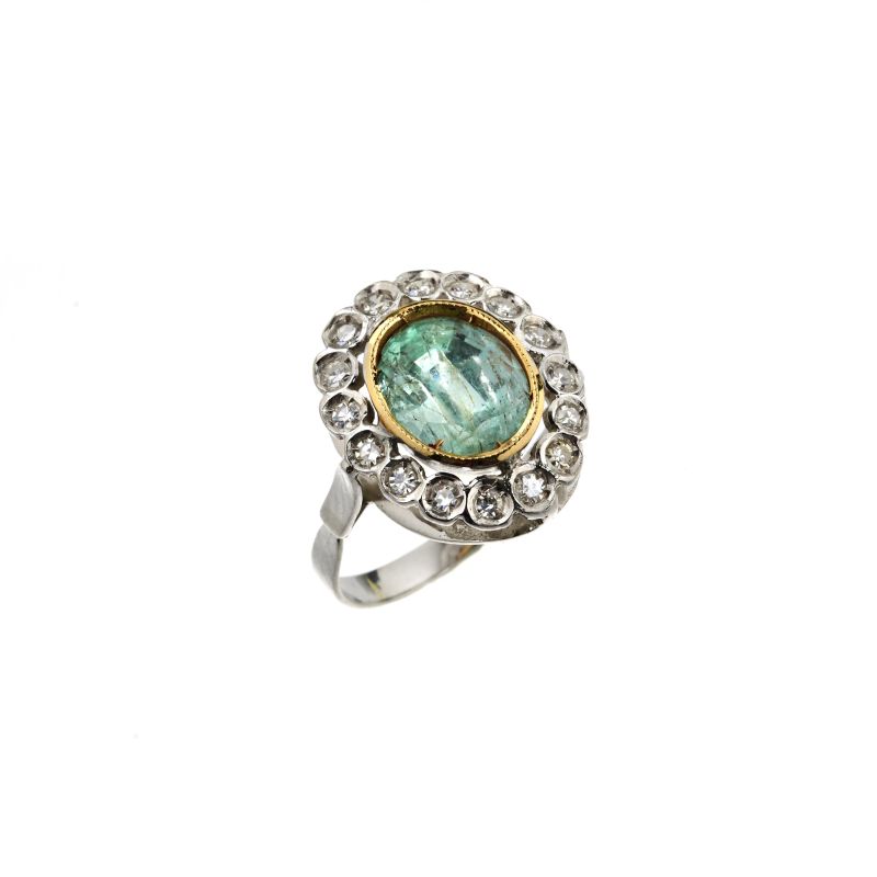 in oro 18kt, impreziosito al centro da uno smeraldo taglio ovale (difetti) di ct 2.50 circa, circondato da una fila di diamanti taglio huit huit per ct 0.50 circa, mis. 13/53, gr. 3