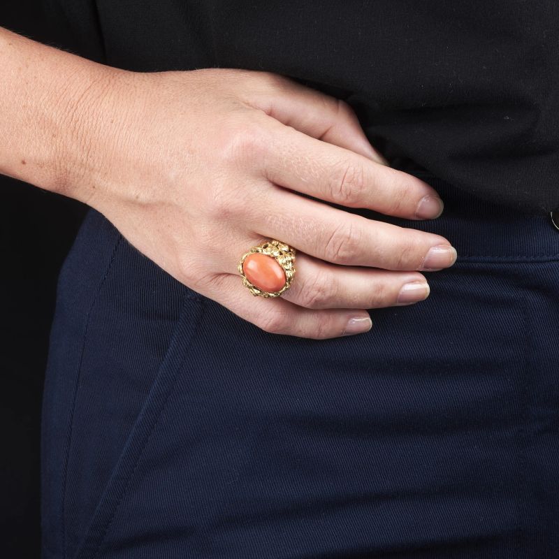 in oro giallo 18 kt, gambo parzialmente traforato e inciso, al centro corallo cabochon 18x13, punzone 750 e del fabbricante, mis 18/58, gr 11