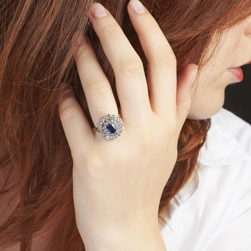 in oro bianco 18kt, impreziosito da diamanti taglio brillante per ct. 1 circa e zaffiro centrale di forma ovale sfacettato per ct. 1,20 circa, punzone 750 e del fabbricante, mis. 13/53, gr. 6
