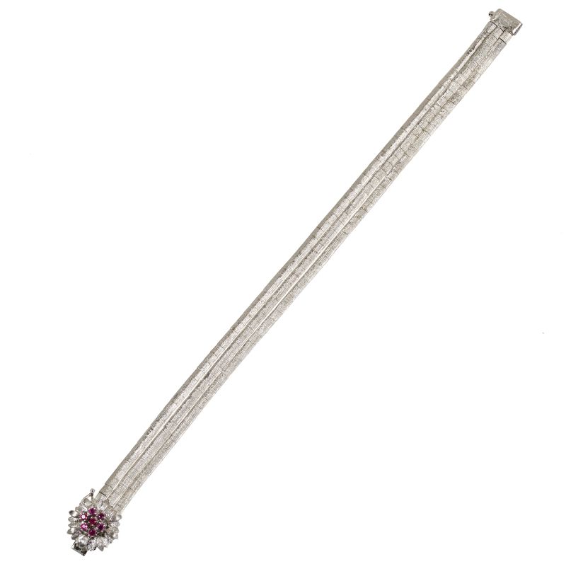 in oro bianco 18kt, impreziosito da chiusura a forma di fiore e piccoli rubini sfaccettati, punzone 750, cm. 19,5, gr. 23