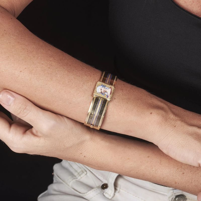 in oro 9kt, decorato in smalto, al centro una miniatura smaltata con scompartimento interno segreto, dim. cm 6x5,5, circonferenza interna cm 16,5, gr. 25