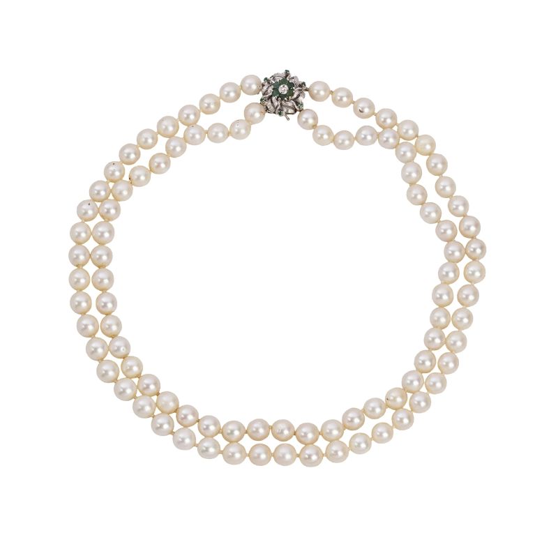 realizzata a doppio filo di perle di mm 8 circa, fermatura in oro bianco 18kt, impreziosita da smeraldi taglio rotondo per ct 0.50 circa e un diamante centrale taglio huit huit, punzone 750, lungh. cm 44, gr. 89