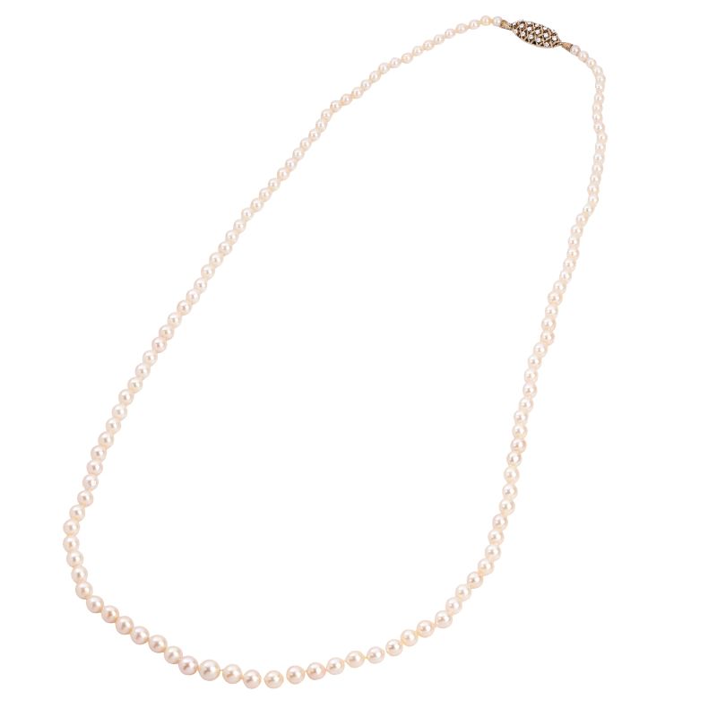 realizzata ad un filo di perle leggermente digradanti di mm 9-5 circa, fermatura in oro bianco 18kt impreziosita da diamanti taglio brillante per ct 0.60 circa, punzoni 750 e del fabbricante, lungh. cm 103, gr. 85