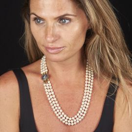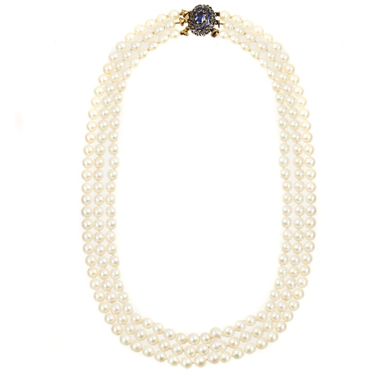 realizzata a tre fili di perle di mm 7 circa, fermatura in oro e argento decorata in smalto blu con pietra semipreziosa centrale, punzoni 750 e del fabbricante, lungh. cm 54, gr. 117