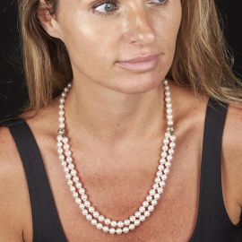 realizzata a un filo d perle di mm 7,5 circa con due fermature in oro 14kt impreziosite da piccoli diamanti taglio huit huit, cm 90 circa, gr. 73 circa
