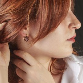 in oro giallo 18kt, impreziositi da granati sfaccettati, gr. 13, dimensioni cm 1,4x1,4 circa