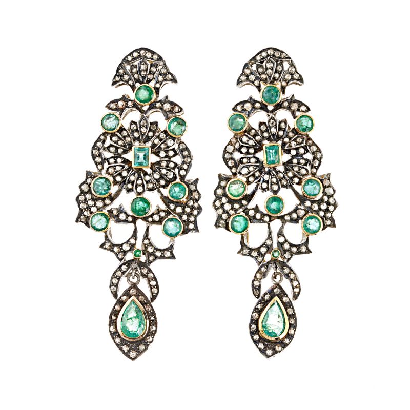 EMERALD AND DIAMOND CHANDELIER EARRINGS IN GOLD AND SILVER