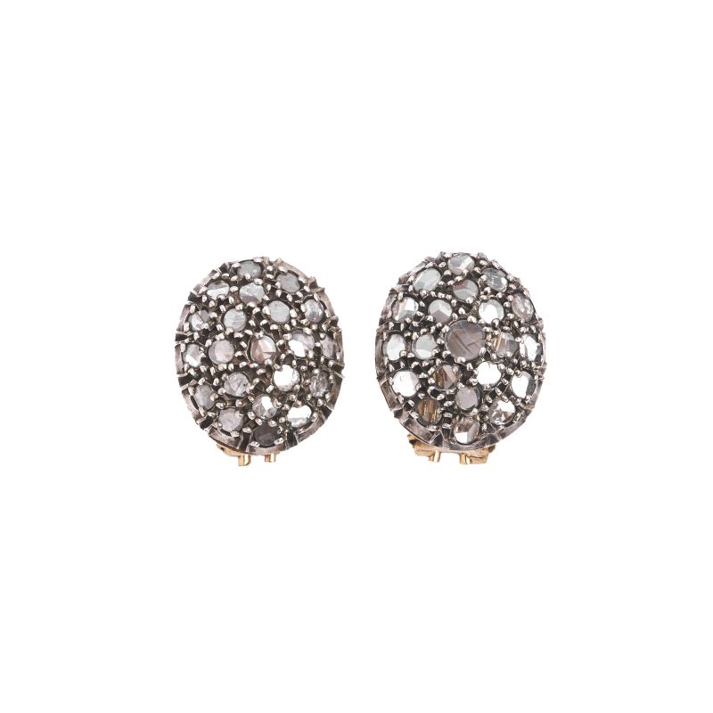 in oro e argento, di forma circolare, impreziositi da rose di diamante, punzoni 750 e del fabbricante, chiusura a clip con perno, dim. cm 1,5x2, gr. 8 complessivi