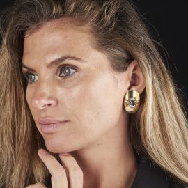 in oro giallo e bianco 18kt, di forma ovale, impreziositi al centro da rubini taglio ovale per ct 1 circa, circondati da diamanti taglio brillante per ct 1 circa, chiusura a clip, dim. cm 2,5x3,5 circa, gr. 18 complessivi