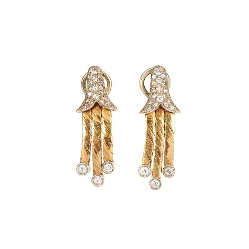 in oro giallo e bianco 18kt, ciascuno composto da tre nastri pendenti, impreziositi da diamanti taglio brillante e vecchio per ct 0.50 circa, chiusura a clip con perno, dim. cm 1x3,5, gr. 10 complessivi