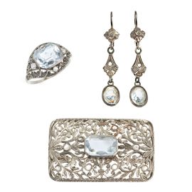 in oro a basso titolo, composta da spilla, anello e paio di orecchini pendenti, impreziosita da pietre sintetiche taglio fantasia e pietre incolore, dim. spilla cm 4x2,5, mis. anello 16/56, lungh. orecchini cm 4, gr. 18 complessivi