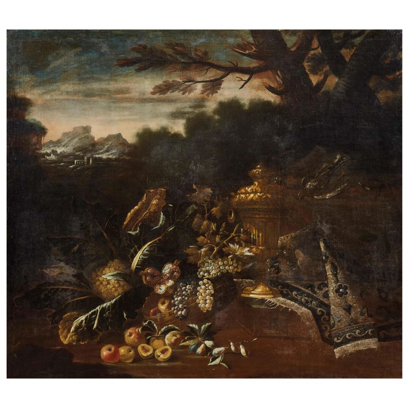 NATURA MORTA DI FRUTTA E FIORI CON TAPPETO E SUPPELLETTILI IN UN PAESAGGIO