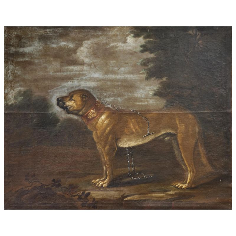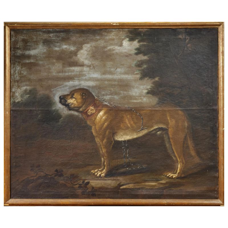 Il collare del cane molosso presenta due stemmi ben riconoscibili: a sinistra quello dei Piccolomini e a destra quello dei Chigi-Zondadari, due delle famiglie più note a Siena. Nell’Archivio Piccolomini Naldi Bandini di Siena è registrato un accordo matrimoniale siglato il 20 aprile 1715 tra un membro della famiglia Piccolomini e una giovane Chigi-Zondadadri. È quindi possibile che il ritratto di questo molosso debba risalire indicativamente a quegli anni, oppure ad una unione matrimoniale precedente di cui non è stato possibile rintracciarne le tracce documentarie.