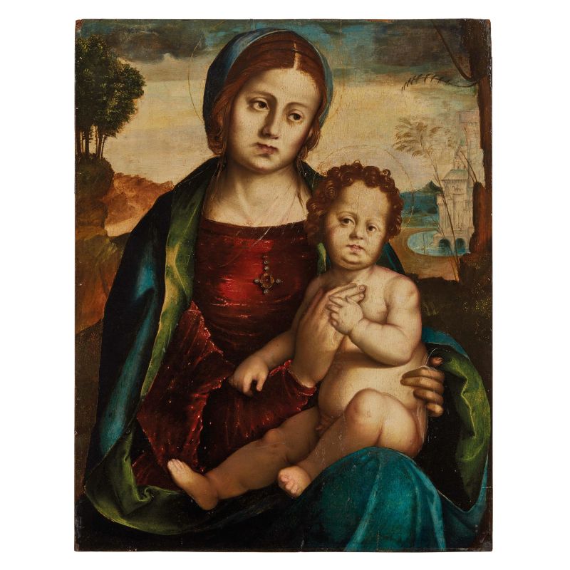 La Madonna con Bambino mostra le migliori caratteristiche e qualità della pittura dello Zaganelli, condensate nella tunica rossa con ancora ottimamente conservate le perle di colore in rilievo a sottolinearne gli sbattimenti di luce, davvero eccezionali, in piacevole contrasto con il blu e il verde del manto. Particolarmente elaborato è anche il gioiello al collo della Vergine, un rubino circondato da perle su cui la luce si posa dolcemente. Alle spalle della scena si dipana un paesaggio, di invenzione nordica, con un castello turrito, bagnato da un fiume, sulla destra e una veduta lontanante di montagne. L'opera è probabilmente testimonianza di un momento tardo dell'attività di Bernardino che qui sembra già confrontarsi, nella forza pittorica dei panneggi, con Dosso Dossi.