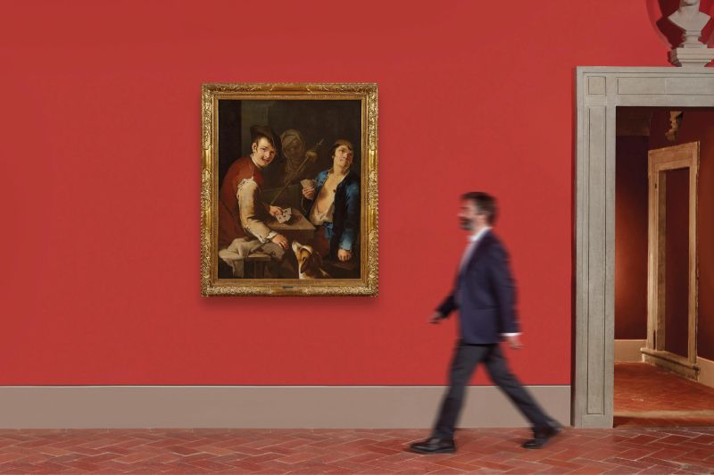 I quattro protagonisti - i due giocatori, la figura sullo sfondo e il cane in basso - instaurano un dialogo diretto con lo spettatore secondo un impianto compositivo ormai collaudato, che ha contribuito a rendere Cipper tra i più apprezzati e stimati interpreti della pittura di genere al principio del Settecento.