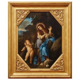 Nel 1610 si trasferì a Roma, al seguito di Domenichino e la sua attività cambiò in funzione di un maggior classicismo. È proprio agli anni romani che si può riferire la tavola ottagonale qui proposta, dove Massari inserisce i tersi cieli azzurri e i paesaggi tipici della pittura bolognese di Guido Reni e poi Guercino, unita al classicismo composto ed elegante nelle figure.