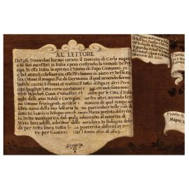 Il cartiglio di sinistra richiama le vicende belliche che segnarono la penisola italiana dopo la morte di Carlo Magno. La cronaca narra che, per sedare le rivolte di quegli anni, papa Giovanni XII invocò l’aiuto di Ottone I di Sassonia, detto “Ottone il Grande”, il quale scese in Italia e sconfisse i ribelli. Deposti i precedenti regnanti, egli ne insediò di nuovi, tra cui figurava lo stesso Platesio. Non sappiamo se sia realmente esistito un principe germanico di nome Platesio; ciò che risulta significativo è che, nel cartiglio di destra, venga riportata una serie di fonti utilizzate per comporre l’albero genealogico. Colpisce in particolare che la prima menzionata sia “Otto frisingense scrittor Germanico”, ossia Ottone di Frisinga (ca. 1112-1158), vescovo, beato della Chiesa cattolica e autore del Chronicon o Liber de duabus civitatibus. Redatta tra il 1143 e il 1146, quest’opera racconta la storia universale dalle origini del mondo fino al tempo dell’autore. Il cartiglio ricorda come Ottone di Frisinga, nel “libro nono della sua historia”, scrisse “particolare belle cose di detto Re” e che “lasciò in Bologna uno chiamato Plates, prefetto del tributo detto mansionatico; dal quale, secondo l’autorità di Verio Beccadelli, scrittore delle antichità di Bologna, discende per retta linea tutta la sua posterità…”.