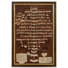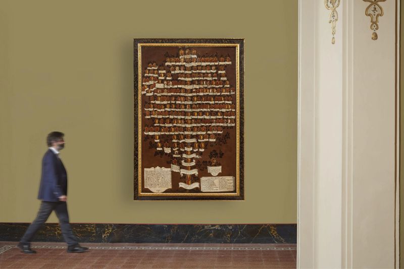 Nel corso del Seicento, in un clima di accesa competizione sociale e politica, molte famiglie nobili sentirono la necessità di affermare e rivendicare la propria ascendenza da personaggi di rilievo della storia e dell’antichità. La legittimazione del sangue aristocratico non si fondava soltanto su titoli, privilegi o patrimoni, ma si nutriva anche della costruzione di genealogie illustri, tramandate attraverso cronache, stemmi, ritratti o, come nel nostro caso, alberi genealogici.
