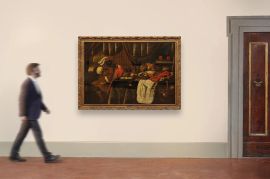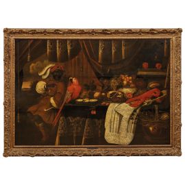 Il dipinto ha una storica attribuzione collezionistica a Barend van der Meer (Haarlem 1659 - ca. 1692). Il riferimento permette di inquadrare geograficamente e stilisticamente il dipinto nella cultura olandese del pieno Seicento. La modalità di impreziosire le stoffe con piccoli tocchi di colore chiaro, o di creare gli sbattimenti di luce su brocche e piatti, rimanda senza dubbio alla pittura di Jurien van Streeck (Amsterdam, 1632-1687) di cui van der Meer fu allievo.