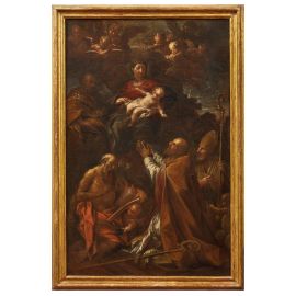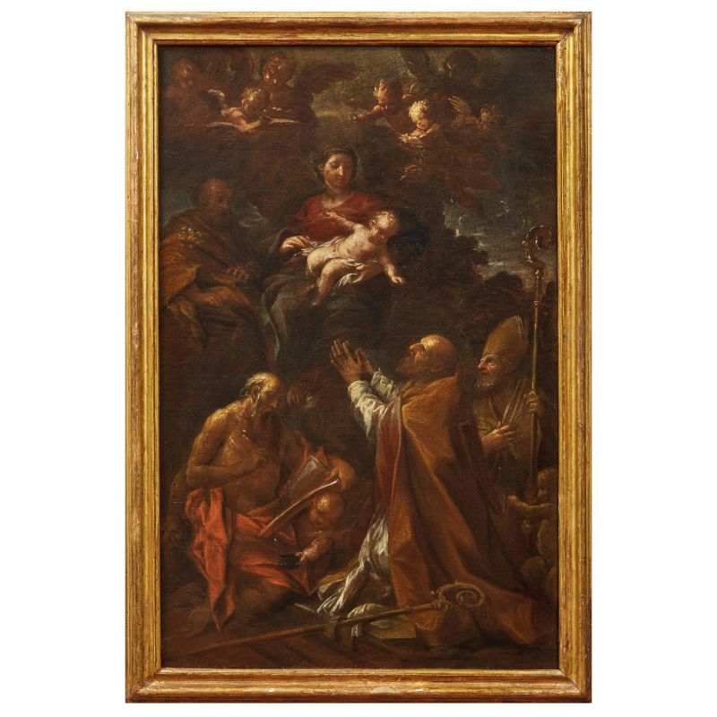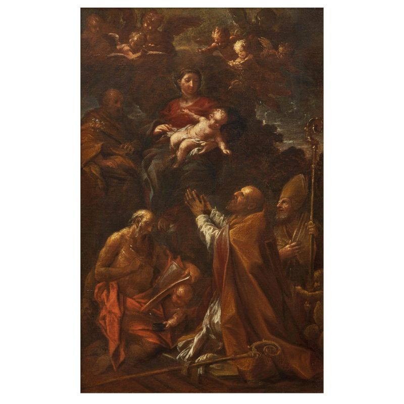 “L’opera è un bozzetto preparatorio per la pala d’altare della cappella di san Girolamo nella cattedrale di San Venanzio a Fabriano. Per volontà testamentaria del defunto Girolamo Possenti la cappella fu fatta decorare tra il 1681 e il 1682 dai suoi figli, che affidarono a Lazzaro Baldi la tela in questione e, nelle pareti laterali, quelle raffiguranti la Visitazione di Maria a santa Elisabetta e il Martirio di sant’Agata. In un insieme saturo di figure, i santi vescovi sono inginocchiati in adorazione della Madonna col Bambino, mentre alla loro sinistra san Girolamo è intento a scrivere, e in alto, in secondo piano, si scorge san Giuseppe, che nella redazione finale della pala d’altare ha lo sguardo rivolto verso l’alto anziché verso la scena centrale. Come si evince da alcune lettere datate tra gennaio e giugno 1980 conservate nell’archivio Molinari Pradelli, il riconoscimento della relazione tra bozzetto e opera compiuta si deve a Vittorio casale, che in seguito ne dava notizia in uno dei suoi importanti contribuiti alla conoscenza di Baldi (Casale 1982, p. 46). Qui lo studioso lodava la piccola tela come ‘uno degli esempi più tipici (e migliori) di quelle atmosfere tenebrose e un po’ negromantiche che caratterizzano certa produzione baldiana’. […] Effettivamente la composizione gremita di figure funziona meglio nella dimensione ridotta e nel piglio energico del bozzetto, piuttosto che nella sua faticosa trasposizione in scala monumentale”.
