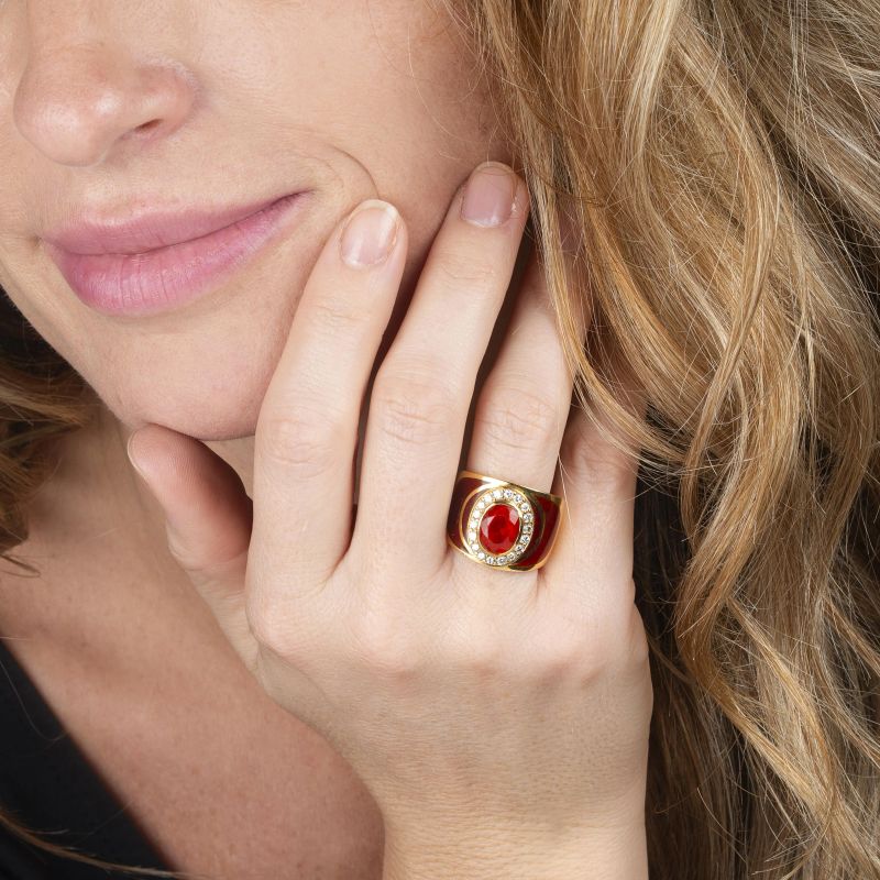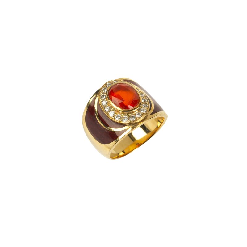 in oro giallo 18kt, decorato con smalto rosso, impreziosito da diamanti taglio brillante per ct. 0,50 circa e da una pietra sintetica arancione al centro, punzone 750, mis. 17/57, gr. 17,5