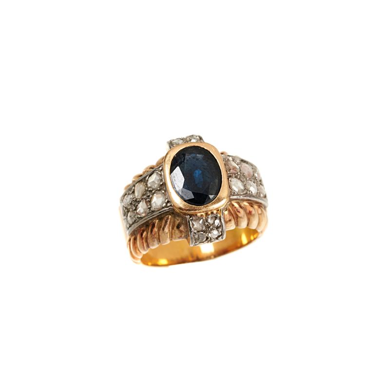 in oro giallo e bianco 18kt, impreziosito da uno zaffiro centrale di forma ovale per ct. 2,50 circa e diamanti taglio a rosa, mis. 17/57, gr. 14