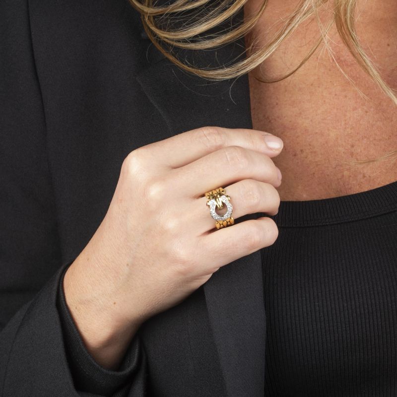 in oro giallo 18kt, al centro un pavè di diamanti taglio brillante per ct. 0.80 circa, con due rubini taglio cabochon,punzoni 750 e del fabbricante, mis. 15/55, gr. 10