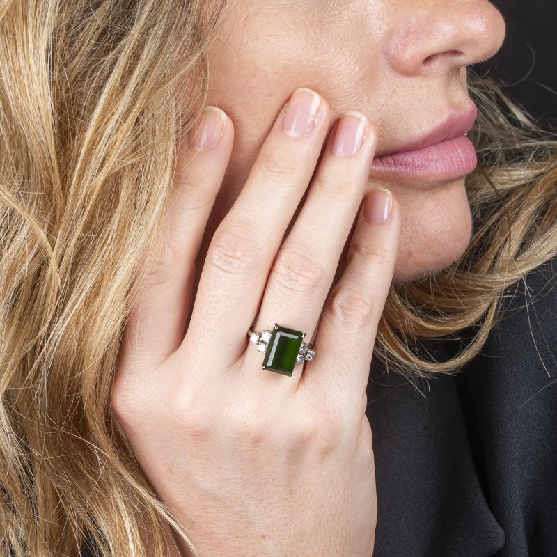 in oro bianco 18kt, al centro una tormalina verde, affiancato da diamanti taglio brillante per ct. 0.40 circa, mis. 14/54, gr. 6
