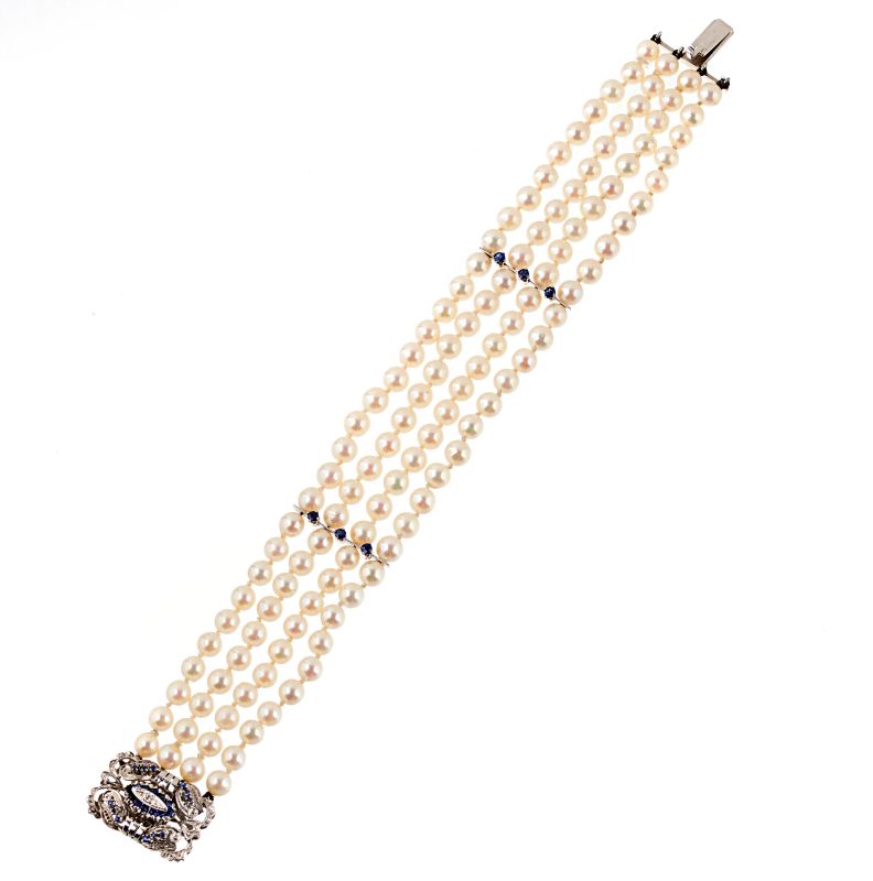 composto da quattro fili di perle coltivate di mm. 6 circa, impreziosito da elementi a barretta e chiusura in oro bianco 18kt con zaffiri per ct. 0.40 circa, punzone 750, cm. 22, gr. 44.5
