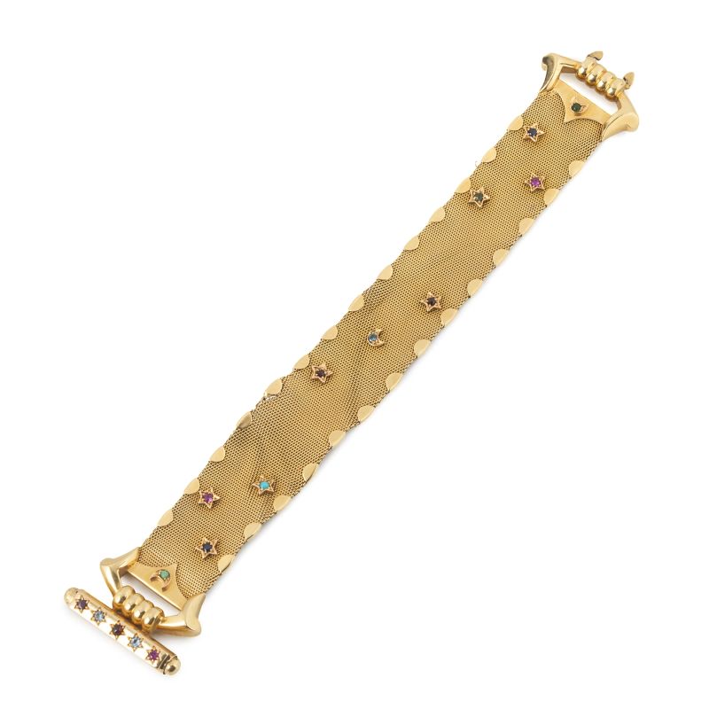 in oro giallo 18kt, con pietre multicolore, punzone 750 e del fabbricante, lungh. cm 19.5, gr. 63