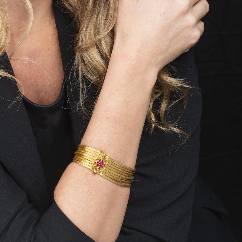 in oro giallo 18kt, realizzato con otto fili, fermatura impreziosita da rubini, punzoni 750 e del fabbricante, lungh. cm 20.3, gr. 58