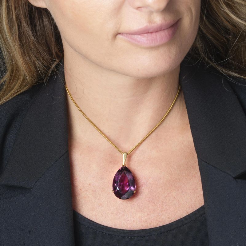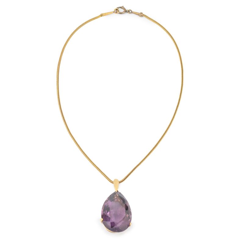 in oro giallo 18kt, da cui pende un ciondolo di ametista taglio a goccia, punzone 18k, lungh. cm 36.6, gr. 19