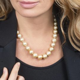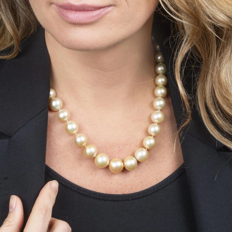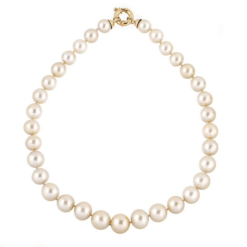 realizzata da un filo di perle South Sea digradanti di mm 14-3 circa, fermatura in oro giallo 18kt, punzoni 750 e del fabbricante, lungh. cm 46, gr. 100