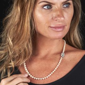 realizzata da un filo di perle digradanti di mm 9-5 circa, fermatura in oro bianco 18kt con diamanti taglio huit huit per ct. 0.40 circa, lungh. cm 54, gr. 34