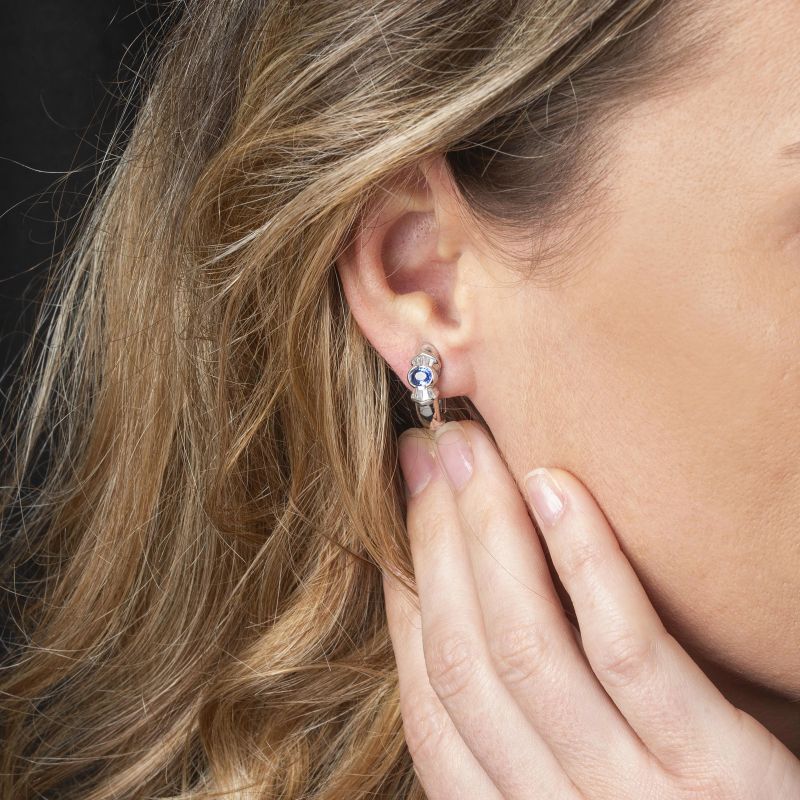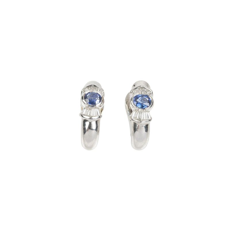 in oro bianco 18kt, impreziositi da due zaffiri taglio ovale per ct. 0.60 circa e diamanti taglio baguette per ct. 0.80 circa, chiusura a clip con perno, punzone 750 e del fabbricante, cm 1.5x1, gr. 6.5