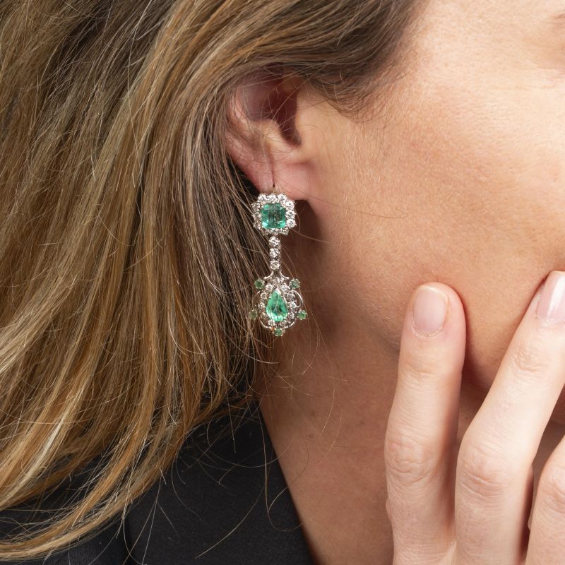 in oro bianco 18kt, impreziositi da diamanti taglio brilante per ct. 2.3 circa complessivi e smeraldi taglio ottagonale, a goccia e tondi per ct. 3.5 circa complessivi, cm. 4x1.5, gr. 18.5