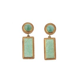 in oro giallo 18kt, con pietra verde cabochon e l'altra incisa, chiusura a vite, punzone 750 e del fabbricante, dim. cm 3.7x1.1, gr. 9