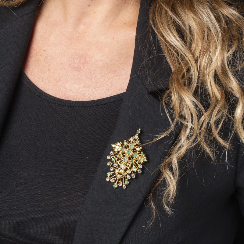 in oro giallo 18kt e argento, impreziosita da smeraldi taglio ottagonale per ct. 1 circa, con diamanti taglio a rosa per ct. 0.30 circa, dim. cm 6.5x4, gr. 23