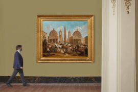 Nella tela conservata presso La Fondazione Roma, l’artista sceglie una prospettiva rivolta verso la Basilica di Santa Maria del Popolo, mettendo in primo piano sulla destra i partecipanti seduti nella tribuna d’onore, solitamente riservata a nobili, dignitari e viaggiatori illustri.