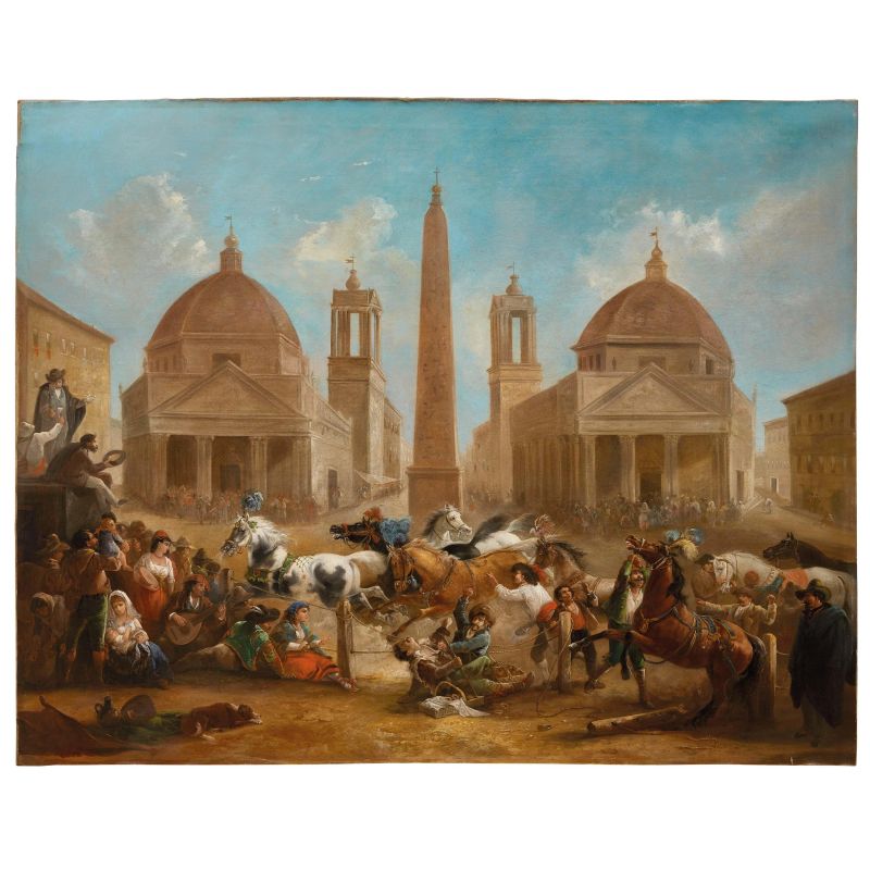 Il dipinto raffigura uno degli eventi più spettacolari e attesi del Carnevale romano: la corsa dei cavalli berberi, che prendeva il via da Piazza del Popolo. Questo evento rappresentava il culmine di una festa antichissima e molto sentita, che si celebrava ogni anno a partire dal giorno dopo l’Epifania, per concludersi con il Martedì Grasso, vigilia del Mercoledì delle Ceneri e inizio della Quaresima.
